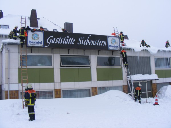 Tröstau, Gaststätte Siebenstern, Dach von Schneelast befreien.