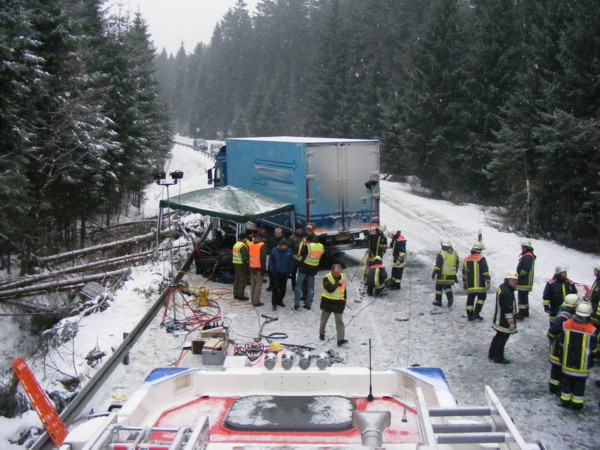 Ein PKW war mit einem LKW kollidiert. Vier Personen, drei davon erlitten tödliche Verletzungen, waren aus dem PKW zu befreien. Zur Unterstützung der Polizei und Sachverständigen wurde die Einsatzstelle ausgeleuchtet und die B 303 gesperrt. ![]() ![]() |