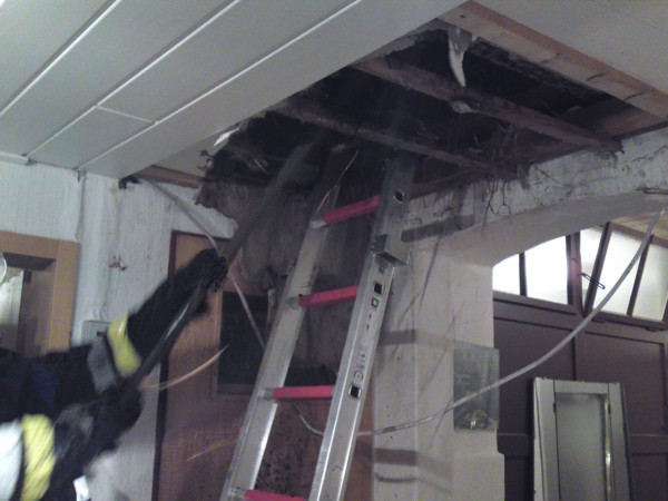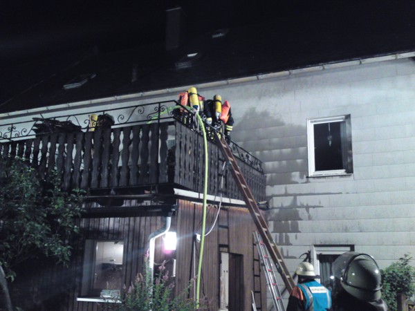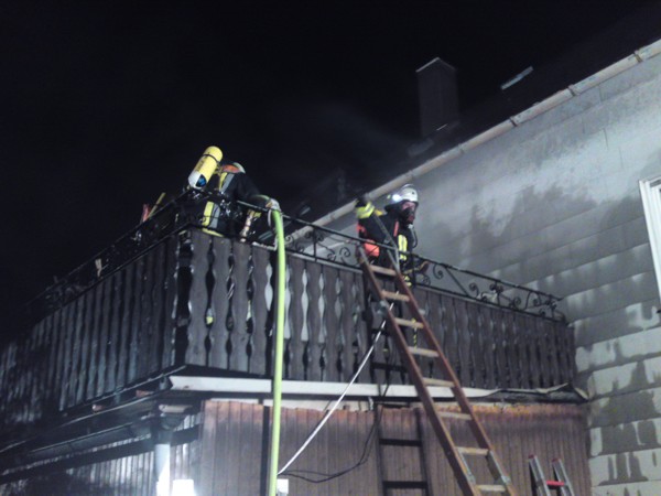 Durch Blitzschlag war der Dachstuhl mit darüberliegenden Balkon eines Wohnhausanbaues in Brand geraten. Bei Eintreffen der Feuerwehr war eine Rauchentwicklung feststellbar. Nach Erkundung und Lokalisierung des Brandherdes u. a. mit Wärmebildkamera, wurde das Dach und die Decke geöffnet. Danach konnte gezielt das Feuer gelöscht werden. ![]() ![]() ![]() |